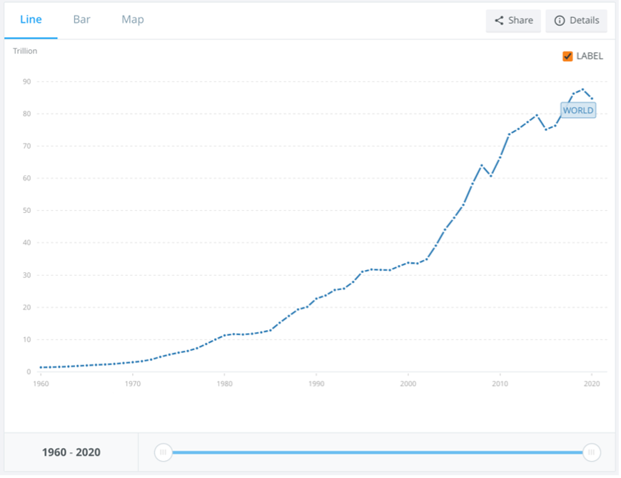 Being widely adopted as a standardised tool by many countries including the UK after the 1944 United Nations Bretton Woods conference, which saw the creation of the World Bank, it is used as the main international economic indicator. Fig. 1 shows a line graph from the World Bank giving a total GDP for all contributing countries and is listed at $84.747 trillion for 2020. A trillion being a million million. That is a lot of money changing hands in 2020. Further data is available to show the size of each country, with the top 3 spots being held by the USA, China and Japan respectively, with UK being in 5th position.